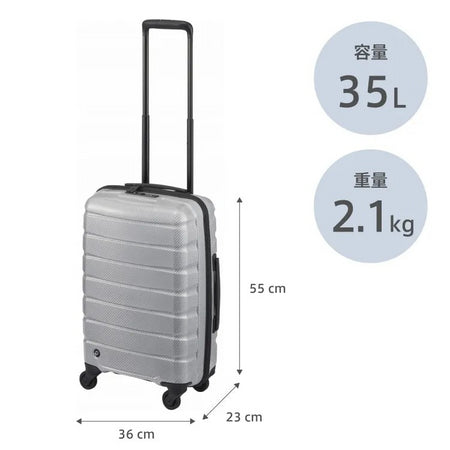 【マジックストップⓇ】手元のスイッチで簡単に操作でき、不意な走行を防ぐキャスターストッパー機能を搭載。【ベアロンホイールⓇ】ホイール部には滑らかな走行を可能にする、ベアリング内蔵のベアロンホイールを搭載。【サイレントキャスターⓇ】公的機関の検査に基づき、従来品に比べ約30%の体感音量軽減が証明された、自社開発のキャスター。【サイズ】機内持込み可能。キャビンサイズ/S 2~3日の旅行向け。国際線、国内線100席以上の航空機に対応。【フロントポケット】PCや書類、チケットなどを収納整理できるフロントポケット。本体側ファスナーを開けるとメイン気室へアクセス可能。【TSダイヤルファスナーロック】TSダイヤルファスナーロック(Travel SentryⓇ認可ロック)搭載で、施錠したまま預け入れ可能。※PC収納可能サイズ:14.0インチ(W33×H24×D2.5cm)