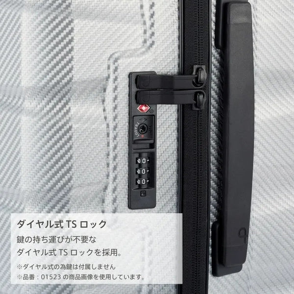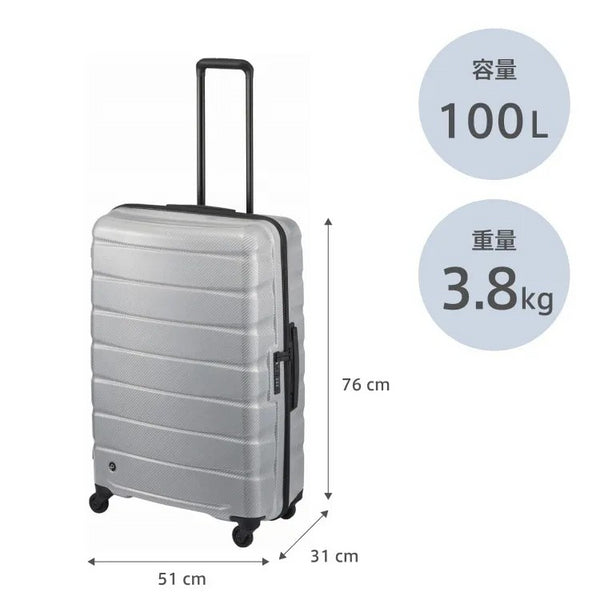 機内預け入れのXLサイズ寸法。容量も100Lとたっぷりです。長期の出張や旅行・留学向けのサイズです。重量は3.8kgとスーツケースの中では最軽量級の軽さを誇ります。ほか機能も万全でキャスターストッパー、ベアロンホイール、サイレントキャスター、TSダイヤルファスナーロックと安心して出張・旅行を楽しめます。
