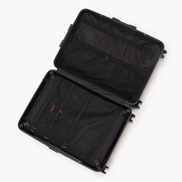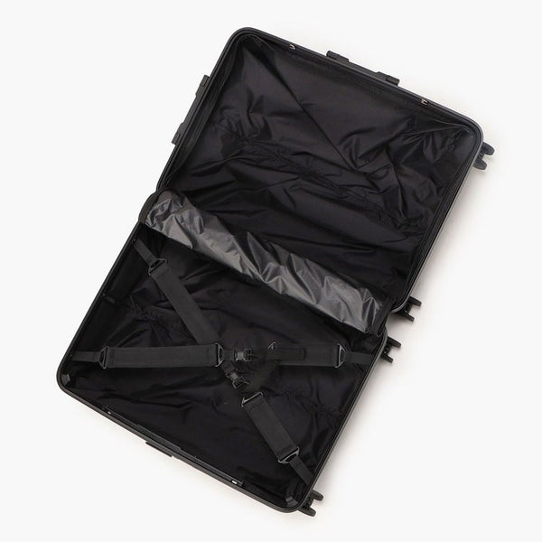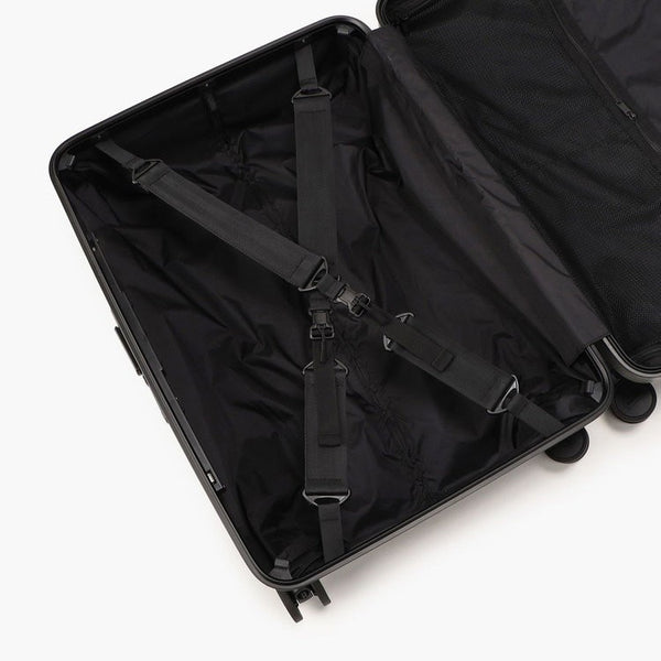 1週間程度の長旅にも対応できる、大容量サイズです。左右のコンパートメントにはクロスベルトが付いており、荷崩れを防止。左側のコンパートメントに付いている仕切りパネルは、機能的なポケットとして使えると同時に目隠しの役割を果たしてくれます。パネルの下にはハンガーとフックが付いており、ジャケットなどをきれいに収納できます。