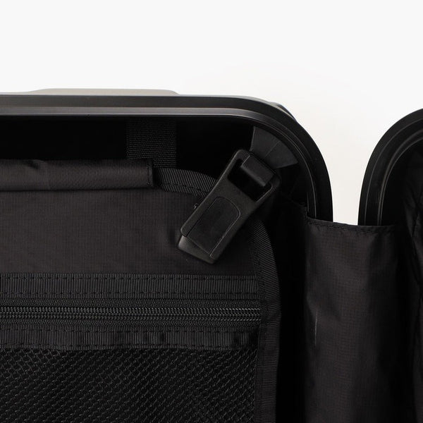 コンパートメントの仕切り版は、裏側にハンガーが付いた仕様。滞在先でそのままクローゼットやバスルームにハンギングして使用することができます。ポケットも充実で、小物のや毎日使う洗面用具などを入れてグルーミングラックとして使うのもおすすすめです。