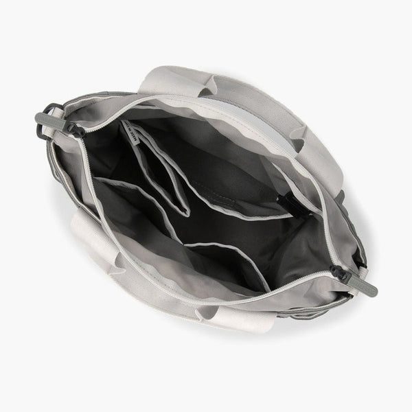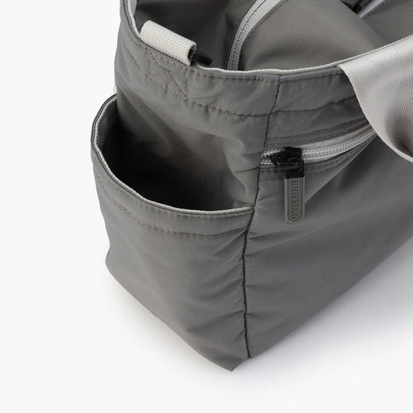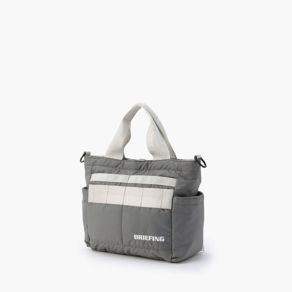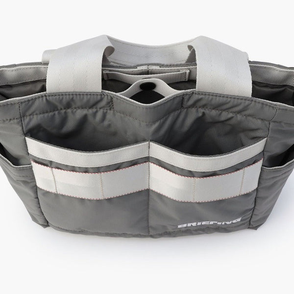 100デニールのコーデュラナイロンをドビー織機にてマイクロリップに織り上げた、BRIEFING GOLFオリジナルの素材をメインに使用。ドビー織機を用いることで凹凸のある織柄を表現され、素材の持つ表情が存在感を発揮。さらにボンディング加工によって、生地の柔らかみが生まれるだけでなく、保護性も向上。撥水加工を施すことで、雨や汚れ等にも強い仕上がりとなっている。機能性も抜群でスコアカードを入れるのに便利なフロントポケットを搭載。内部にもポケットやキーホルダーを搭載し小物類の持ち運びに便利な仕様に。開口部には天井ファスナーを配置。ファスナーを閉じれば中身が見えず、野外ではカラス対策にも◎。ハンドル部分に厚みを持たせ、持ち運びしやすいよう配慮されています。